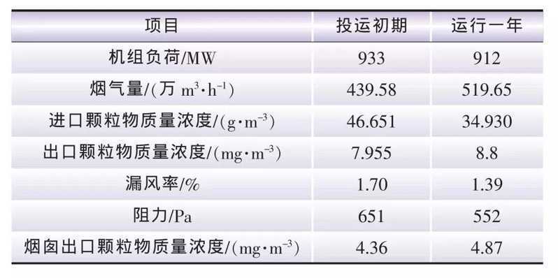 河南平頂(dǐng)山發電分公司2×1 000 MW機組超低(dī)排放(fàng)改造工程,是國(guó)內首台1 000 MW等級超淨電袋項(xiàng)目,於2015年改造完成並投運。其燃用煤種為山西長治貧煤,其灰(huī)分高達39.78%,飛(fēi)灰中SiO2和Al2O3含量高,比電阻較大(dà),是典型的劣質煤(méi)。該工程原采用3室(shì)5電場靜電除塵器,並經過低低溫電除塵提效改造,但未能達標排放(fàng),好終采用(yòng)超淨電袋技術方案再次提效改造[19]。2號(hào)爐超淨電袋投運初期和運(yùn)行一年的性能測試(shì)結果(guǒ)見表2。測試表明(míng),投運初期和運行(háng)一年後的各項性能都非常(cháng)穩定地滿(mǎn)足設計要求,除塵器出口及煙囪出口顆粒物排放均達到超低排放(fàng)要求。