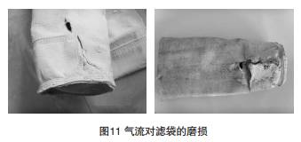 過高的(de)過濾(lǜ)氣速會使粉塵衝擊、磨損濾袋,也會使 濾袋的織物纖維張力受損。除塵(chén)器的進氣分(fèn)布不均,容 易使高含量的大顆粒粉塵(chén)直接衝擊局部濾(lǜ)袋(dài),造成廢氣 進口處部分濾袋穿(chuān)孔(如圖11)。