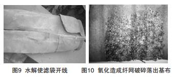 水解痕跡(jì)為顏色(sè)混濁,濾(lǜ)袋強度(dù)嚴重下降,易破損。縫(féng)紉線發生水解後,濾袋從縫(féng)紉線(xiàn)處開裂,使濾(lǜ)袋不再是筒狀(zhuàng)。濾袋縫紉線斷裂如(rú)圖9。