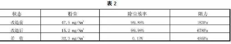 (1)電袋複合式除塵器改造前後煙塵排放濃度及本體阻力對比(見表2)。