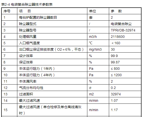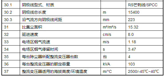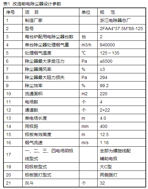 改造前(qián),本工程配套兩台浙江電除塵器總廠(即現在菲(fēi)達環保)生產的2FAA4*37.5M*88-125型雙室四電場臥式除塵器(qì),電除(chú)塵控製部(bù)份采用福建龍岩空氣淨化(huà)設備廠生產的GGAF02-1.0/72H型產品,設計除塵效率≥99.2%,極板型式為大C型板,極線型式為(wéi)全部為螺旋線(xiàn)配輔助電極,出(chū)口設槽極板,振打方式全部采用(yòng)側部饒臂錘振打。其一、二、三、四電場高壓供電和控製裝置是GGAJ02-1.0/72CG型的整(zhěng)流變壓器。本工程改造前(qián)電(diàn)除塵器設計參數(shù)見表(biǎo)1。
