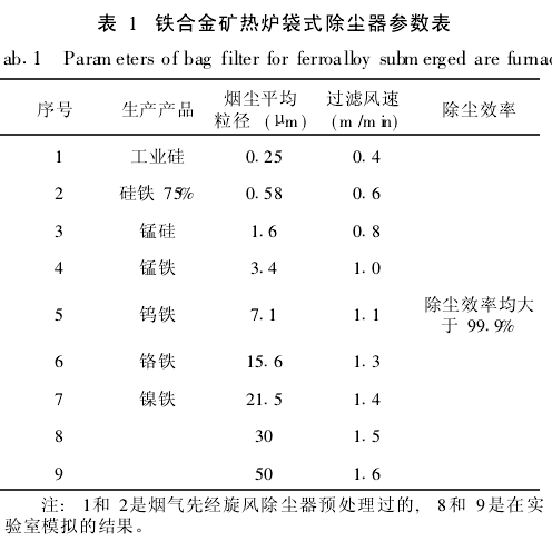 這裏選取了用在鐵合金礦熱(rè)爐煙氣除塵(chén)的19台(tái)除塵器,鐵(tiě)合(hé)金礦熱爐煙塵由於煙塵粒徑細、煙(yān)氣溫(wēn)度高,治理難度極大,不論機械式除塵器、濕式除塵(chén)器,還是靜電除塵器,均不能達標,隻有采用布袋除塵器,且布袋除塵器中又隻能(néng)選取脈衝清灰和逆氣流反吹清灰才行,因(yīn)此19台(tái)除塵器均采用長袋低壓脈衝袋(dài)式除(chú)塵器,所有(yǒu)礦熱爐煙(yān)氣在進入除塵器前,經冷(lěng)卻將溫度降低至200℃左(zuǒ)右,廢氣中煙(yān)塵濃度在進入除(chú)塵器前均在1.2~2.0g/Nm3之間,這樣就基(jī)本排除了煙塵濃度和煙氣濃度對過濾風(fēng)速的影響。具體參數見表1。