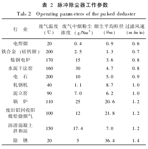 過濾(lǜ)風速(sù)到底和廢氣溫度、煙粉塵(chén)濃度有何具體關係,我們可從實驗上加以研究(jiū),表2是作者為各行業設計的除塵(chén)器的工作參數表(僅(jǐn)選取了除塵(chén)效率在9919%以上的設備或出口排放濃度小於30mg/Nm3的設備)。