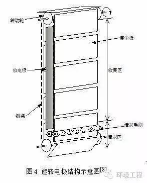 旋轉電極式電除塵器與常規電除塵器的除塵原理完全相(xiàng)同,在清灰方式(shì)上有很大改變。旋轉電極是由若幹個(gè)小塊極板固定在板(bǎn)鏈(liàn)上(shàng)低速旋轉,極板由原來的整體壓型板改為小塊(kuài)極板,通過板鏈帶動(dòng)旋轉。其清灰方(fāng)式采用旋轉鋼刷清灰,從根本上改變了常規電除塵器的振打裝置清灰,徹(chè)底避免了振打清灰造(zào)成的二次揚塵, 同時也解決了(le)高(gāo)比電阻粉塵的“反電暈”問題。