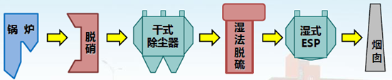 如圖1所示,濕(shī)式靜電除塵器一般布置在濕法脫硫之後。濕法脫硫出口煙氣中的(de)大部分粉塵已被幹式電除塵除去(qù),並成為夾帶石膏顆粒(lì)的濕飽和煙氣,通過濕式靜電除塵器處理後,達(dá)到排放要求,由煙囪排出。